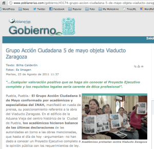 Puebla, Puebla.- El Grupo Acción Ciudadana 5 de Mayo conformado por académicos y especialistas del INAH, manifestó en rueda de prensa, su posicionamiento referente a la obra del Viaducto Zaragoza. En el edificio de la Aduana Vieja del centro histórico de la Ciudad de Puebla, los académicos hicieron balance de las últimas declaraciones de las autoridades en torno a las obras mencionadas, que hasta el día de hoy –argumentan- no han dado a conocer un Proyecto Ejecutivo completo a la opinión pública con los requerimientos de ley.