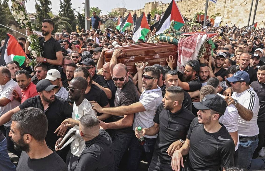 El cortejo fúnebre de la reportera se vio empañado por enfrentamientos con las fuerzas policiales israelíes, que utilizaron granadas de aturdimiento contra una multitud en Sheikh Jarrah, en el este de Jerusalem, alegando que los dolientes habían arrojado piedras y objetos a la policía. Las imágenes del funeral muestran la salida caótica del ataúd del hospital Francés, rodeado de dolientes, que cargaban el cuerpo hacia su lugar final de reposo, en el cementerio cristiano en Monte Zion, a las afueras de la Ciudad Vieja.